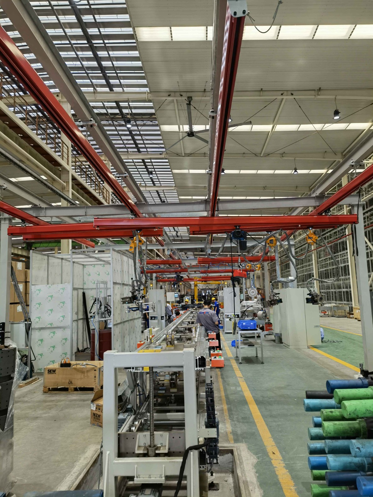 KBK起重機標準組件。由懸掛裝置、軌道、道岔、行走小車、電動葫蘆、移動供電裝置(滑線)以及控制裝置等組件組合而成,起升裝置主要采用環(huán)鏈電動葫蘆,也可吊掛一些機械手或焊槍之類,作為工具滑軌使用,起重量一般2000kg。只需簡單地懸掛在廠房頂板或梁架上便可實現(xiàn)物料的空中直接輸送,因此被廣泛地應用于各行各業(yè)的物料輸送環(huán)節(jié)或系統(tǒng)。